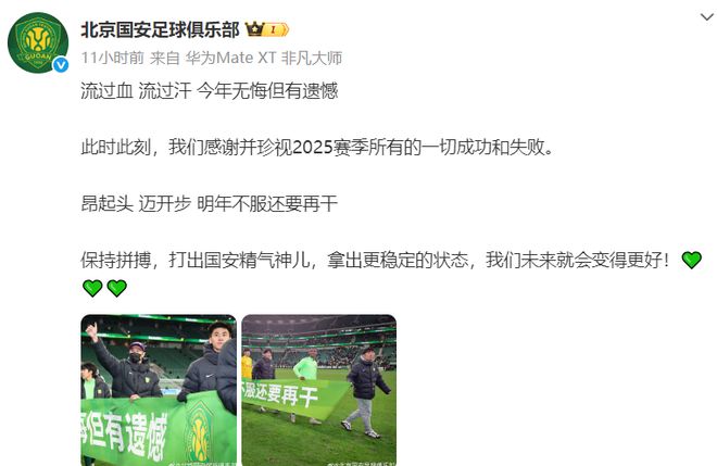 赛后,国安球员拉出两张横幅,第一张上面写着:“流过血 流过汗 今年无悔但有遗憾”。第二张印着:“昂起头 迈开步 明年不服还要再干”。俱乐部官微上还打出一句话:“保持拼搏,打出国安精气神儿,拿出更稳定的状态,我们未来就会变得更好!”