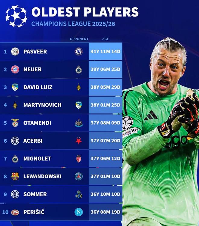 北京时间10月25日,德转统计出了本赛季至今欧冠出场最年长的10名球员,阿贾克斯的门将帕斯维尔第一,诺伊尔第二,目前效力于塞浦路斯球队帕福斯的大卫-路易斯第三。