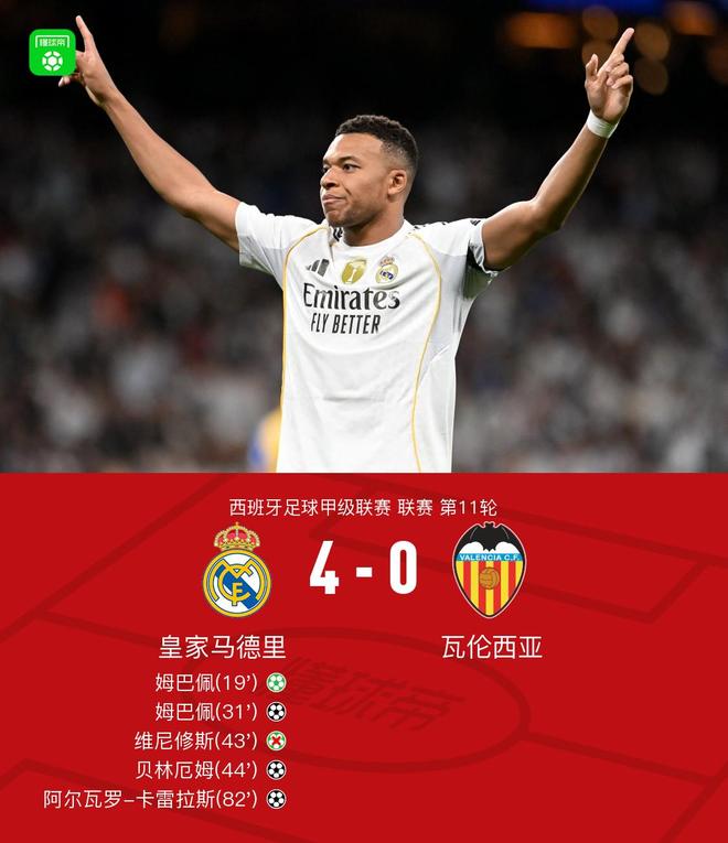 北京时间11月2日,西班牙足球甲级联赛第11轮展开较量,皇家马德里坐镇主场迎战瓦伦西亚。上半场,银河战舰获得点球,姆巴佩一蹴而就。居莱尔助攻,姆巴佩凌空垫射再下一城。卡雷拉斯造点,不过维尼修斯主罚被扑出。巴尔韦德长传助攻,贝林厄姆兜射入死角。下半场,卡雷拉斯轰入世界波,收获个人加盟皇马的处子球。全场比赛结束,皇马4-0轻取瓦伦西亚,获得各项赛事6连胜。